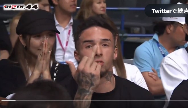 カメラに向かって中指を立てる木村ミノル(RIZIN FF EnglishのXより)