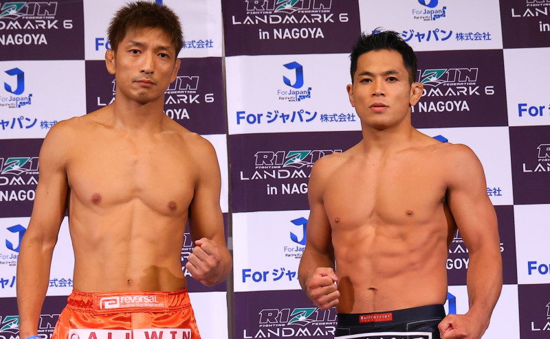 階級上げて計量パスした所(左)と割れた腹筋を見せたヤマニハ(右)(C)RIZIN FF