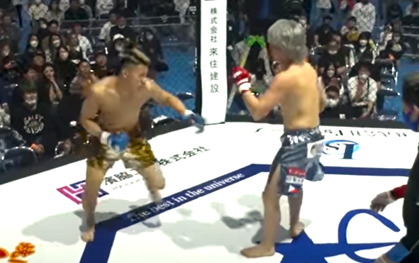 虎之介(左)がジョリー(右)からダウンを奪う(2022年、『弘輝チャンネル』)
