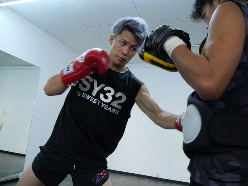 普段のサウスポーではなく、右構えでミット打ちを行った門口(C)RISE
