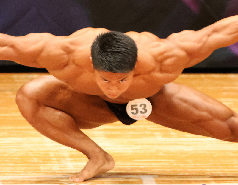 相澤はフリーポーズで、まるで刃牙の範馬勇次郎のポーズから様々な筋肉をアピールするポージングをを見せた
