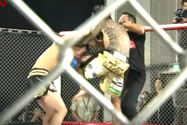シェンロンのヒザ蹴りが左目を直撃(『朝倉未来YouTubeチャンネル』)