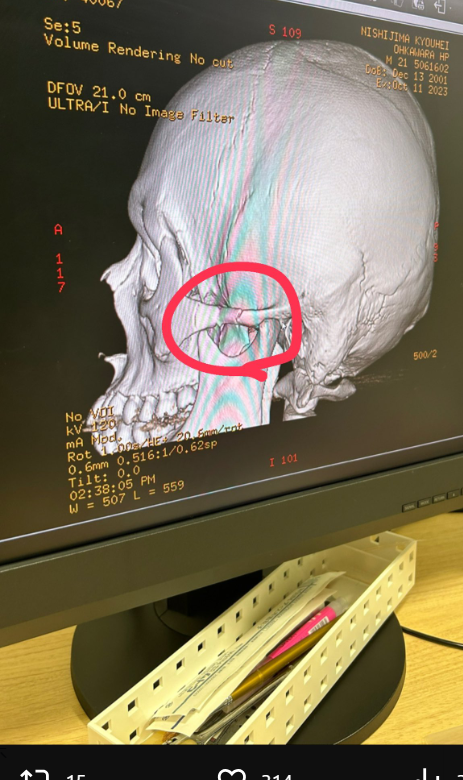 西島が公開したレントゲン写真。赤い丸で囲んでいる箇所が頬骨弓。ポッキリ折れている(@official_kyohei)