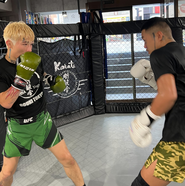 平本(左)と芦澤(右)がスパーリング(剛毅會提供)