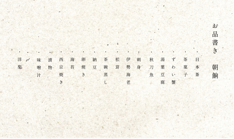 メニュー表、朝餉(あさげ) 大豆作りから京都美山で始めるオンリーワンのこだわりゆばをメインとした朝食を用意している