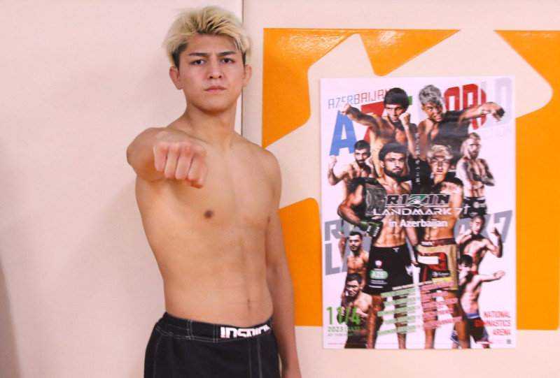 アゼルバイジャン大会ポスターの横で右の拳を前へ出す鈴木