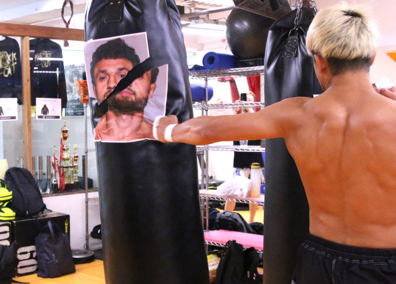 サンドバッグにケラモフの顔を貼り、鈴木がパンチでビリビリに