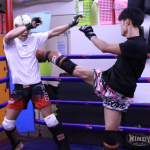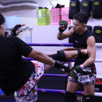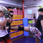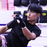 鈴木千裕(左)とのスパー、重森のミドルキック