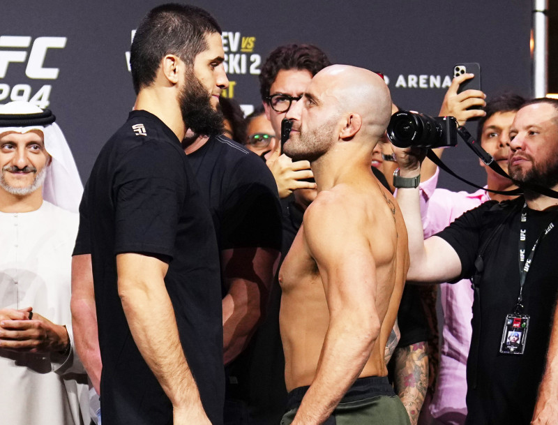 フェイスオフでも、マカチェフ(左)とヴォルカノフスキー(右)の身長差は明らかだ。©️UFC
