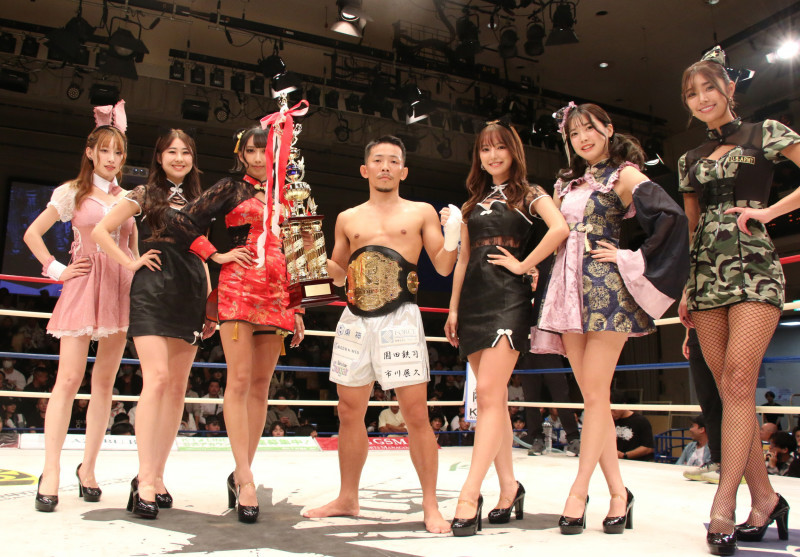 コスプレ衣装のKrushガールズ6人と、フライ級新王者・悠斗