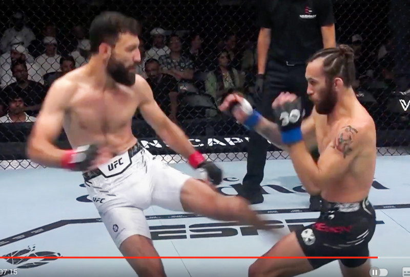 バシャラート(左)のインローがヘンリーの下腹部に直撃(UFC Japan公式YouTubeより)