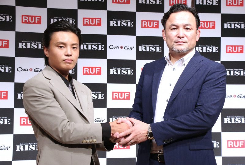 RISEの伊藤隆代表(右)が引退を表明した風音(左)を労った