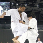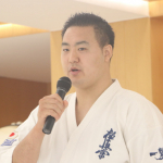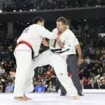 決勝で上田(左)にローを効かせるイエロメンコ
