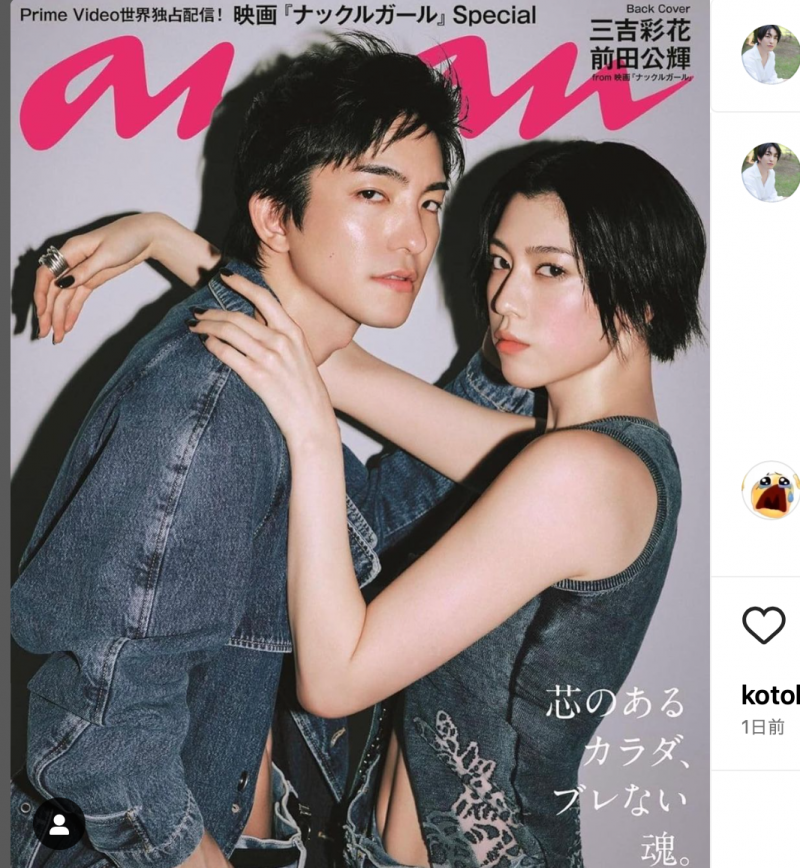 腹筋が縦にクッキリ割れている三吉彩花、左は『ナックルガール』で元恋人役の前田公輝( @maeda.goukiより)