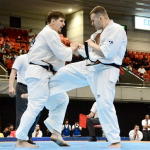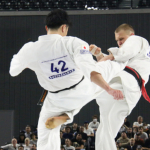 得意の膝蹴りで攻めるナシメント(左)