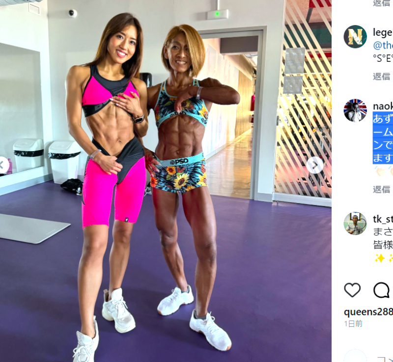 ダンシー(左)は、澤田(右)と“最強腹筋”をチラ見せ(@az.dancy)