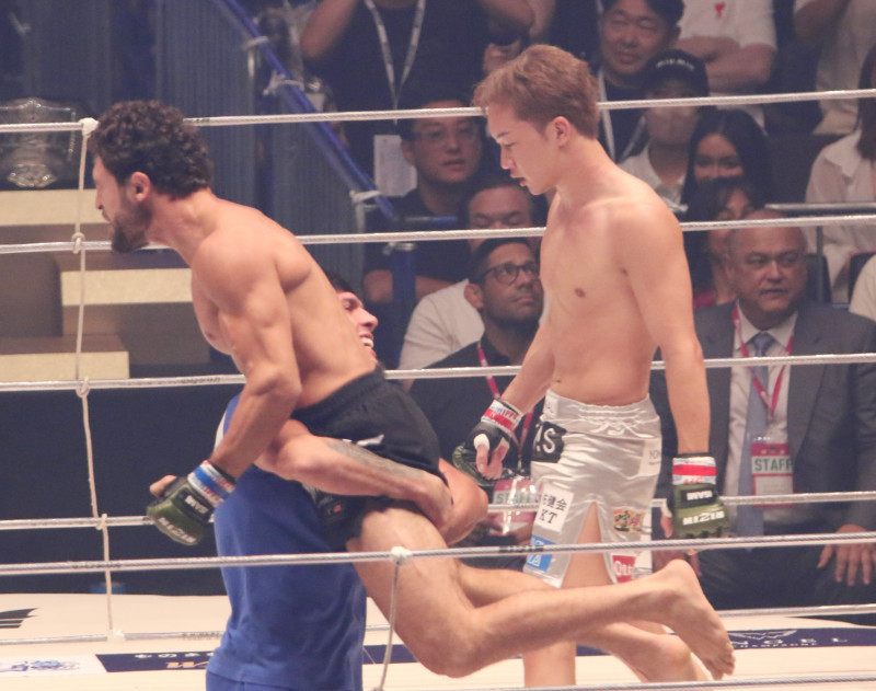 敗戦し呆然とする朝倉未来(右)と、勝利に歓喜するケラモフ