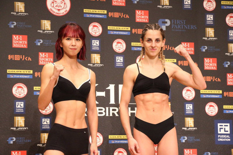 前戦の菅原(左)、対戦したマリア・ネラ(右)の計量