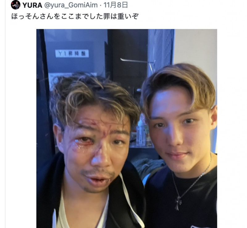 乱闘と試合で傷だらけになったほっそんの顔(@yura_GomiAimより)