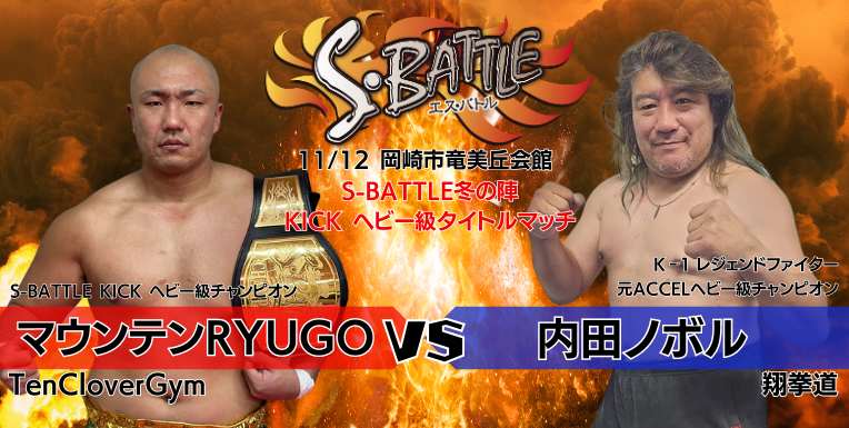 S-BATTLE 2023 KICKヘビー級タイトルマッチで対戦する王者マウンテンRYUGO(左)と内田ノボル(右)