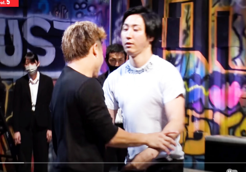 10人ニキ(左)が溝口に組み付く(朝倉未来YouTubeより)