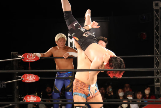 征矢が憂流迦を持ち上げボディスラムへ
