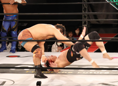 征矢が憂流迦を持ち上げボディスラムへ