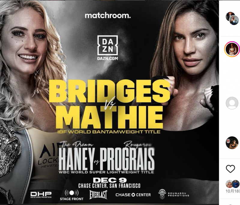 ブリッジス(左)、12月9日(日本時間10日)に2度目の防衛戦。モデル美女ボクサー、マシー(右)と激突