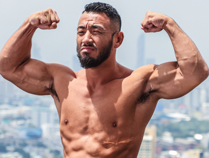 “野獣”手塚裕之、ムキムキのマッスルポーズ!©️ONE(※前回の計量時)