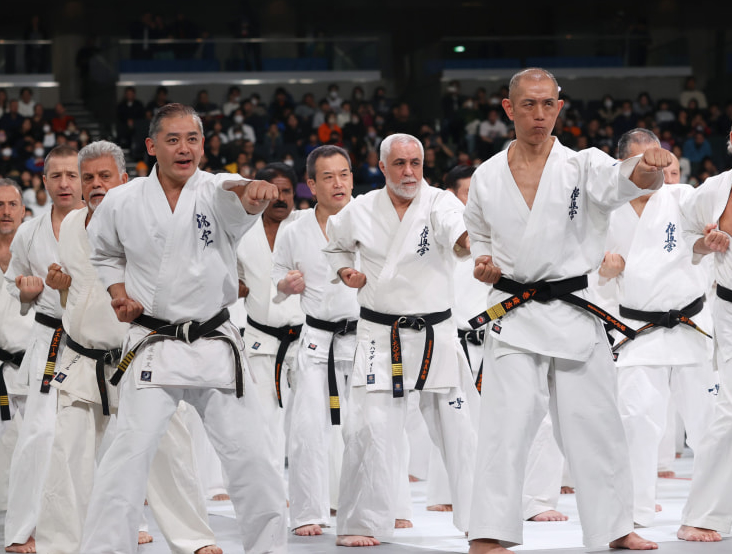 松井館長の号令に合わせ正拳突きをする極真会館総本部の八巻建志師範(右)と、錬空武館の高久昌義師範(左)