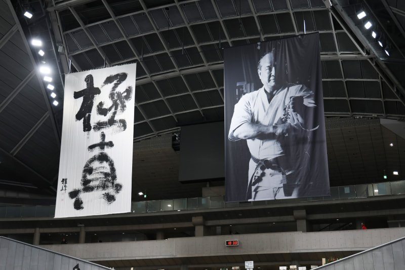 会場には大山総裁の垂れ幕がかかっていた