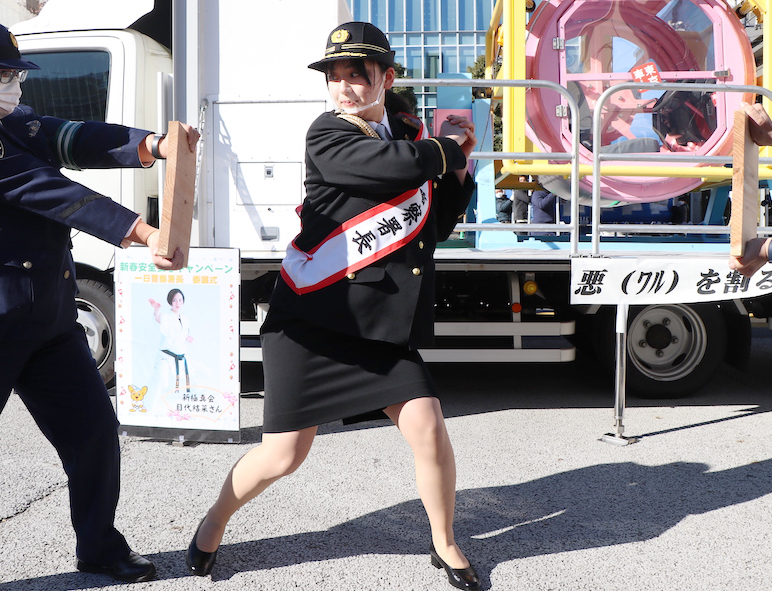 目代が一日警察署長に!ミニスカ警官姿で板割り