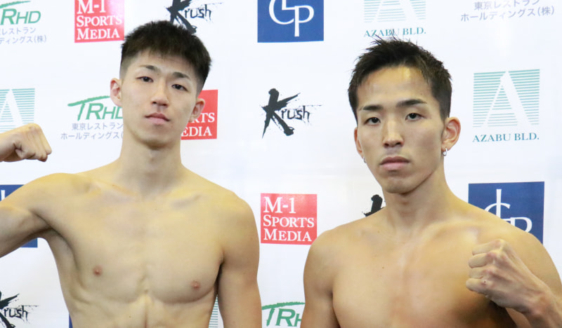 王者・稲垣柊(左)と挑戦者・小嶋瑠久(右)が計量パスした