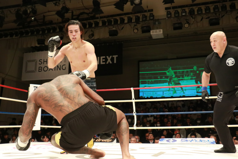 海人のヒザ蹴りでグランダーが倒れる