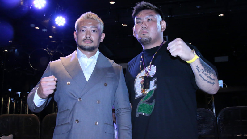 愛鷹亮(左)は、実方(右)と引退エキシを行う