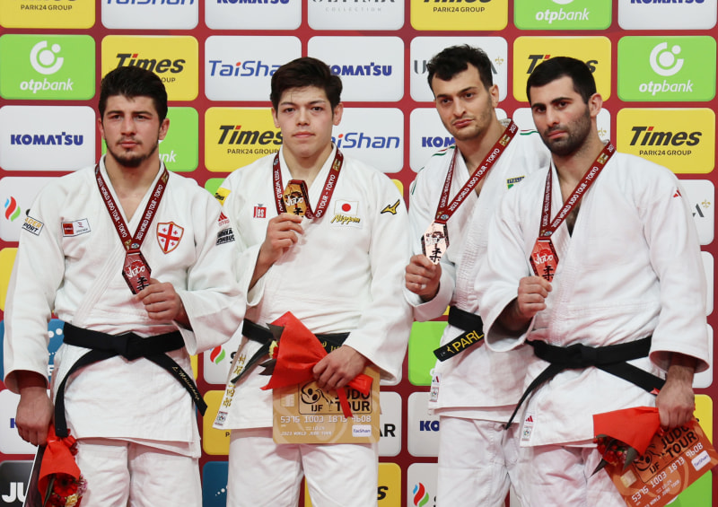 左から2位のマイスラーゼ、優勝の村尾、3位のパルラーティ、同3位のイゴルニコフ