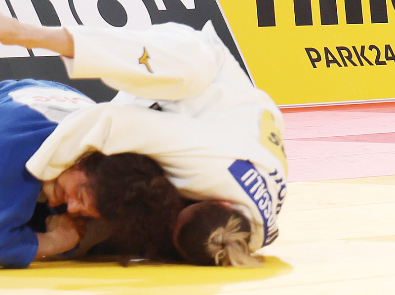 亀になった相手のエリを掴み全体重を乗せサイドに