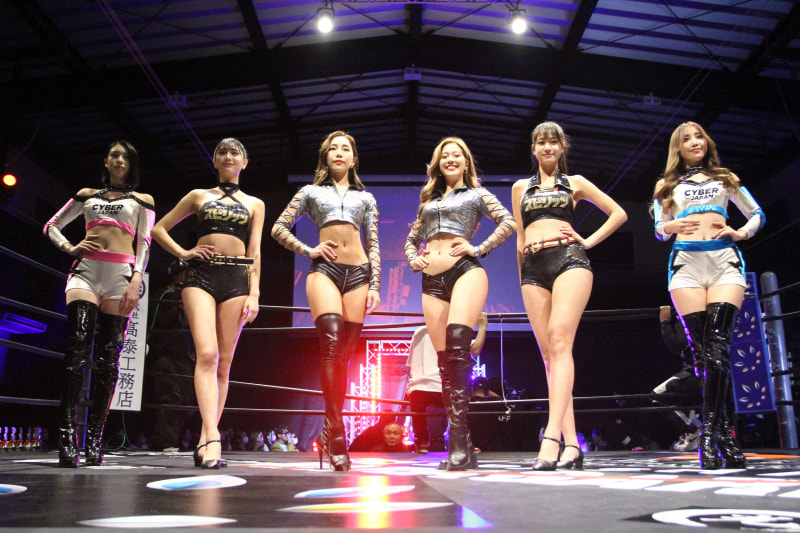ラウンドガールの全身写真、(左から)CHIAKI、斎藤恭代、麻田ゆん、RIO、岡本杷奈、RINA