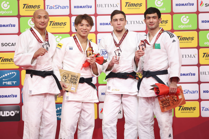 表彰式。左から銀:バスクフー(モンゴル)、金:阿部一二三、銅:ビエル・デニス(モルドバ共和国)、銅:アガマンメドフ・ヘキム(トルクメニスタン)