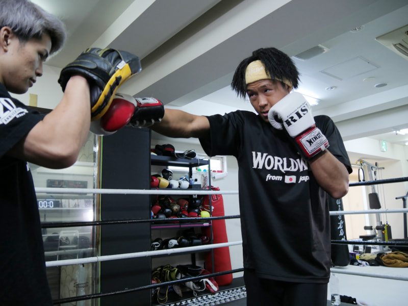 RISEフェザー級王者・門口の持つミットにパンチを打ち込む鈴木