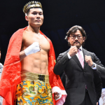 勝利の王冠を冠るリュウとカルロスK-1プロデューサー(右)