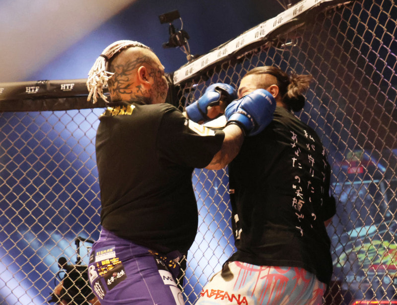 所沢のタイソンが(左)、ドラえもんパンチをごぼう奥野へ
