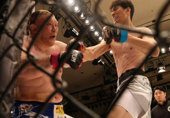 巨人江畑(右)が120kg巨漢をKOするシーン。江畑の右が炸裂!