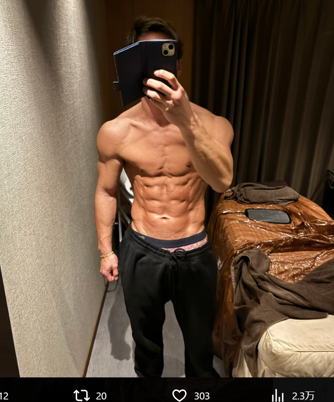 今回、松倉が投稿したバキバキボディ。腹筋の割れ方が凄い(@bbseeksm)