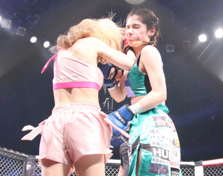 試合で打ち合う宮里(右)と、はろーあにー(左)