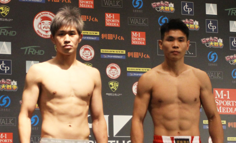 和島大海(左)とオウヤン・フェンが計量パス