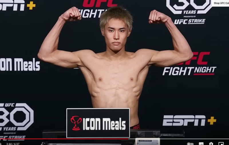 平良が仕上げたボディで計量パス!マッスルポーズを決めた(UFC公式YouTubeより)