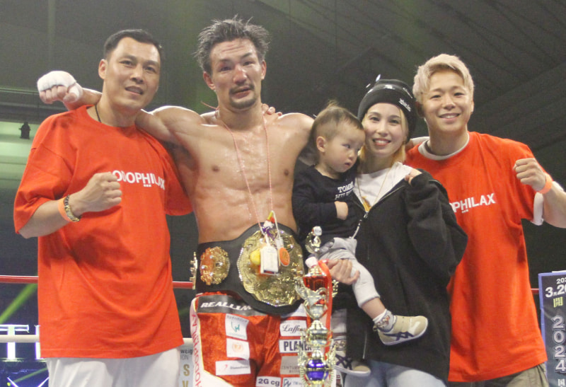 ベルトを巻いた松倉、セコンドの武尊(右)、家族やトレーナーと