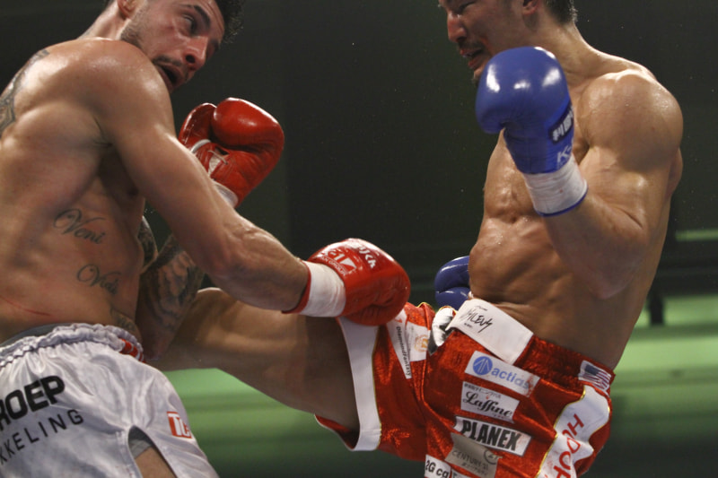 右のミドルキックを放つ松倉