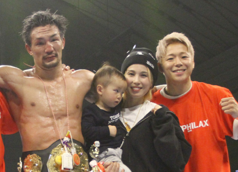 松倉と、妻で元グラドル犬童美乃梨と第一子、武尊 勝利後の喜びの姿